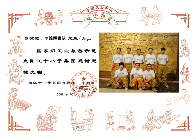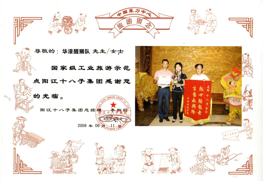 2008年6月11日,华濠醒狮队带着华濠龙舟协会回赠的锦旗来到了阳江十八仔集团总部